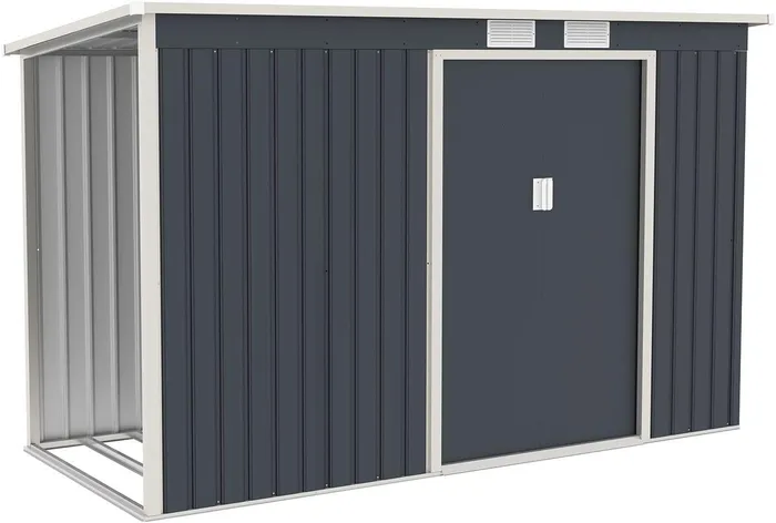 Abri de jardin avec toit en appentis en tôle d'acier galvanisée. Résiste aux intempéries, aux rayons UV et à la saleté. Espace de rangement avec abri latéral pour stocker le bois de chauffage et ranger les outils ou meubles de jardin. Châssis métallique robuste pour une bonne stabilité, permet d'installer un plancher supplémentaire. Double porte coulissante pour un accès facile, même en hiver. Ventilation à l'avant pour une bonne circulation de l'air, évite la condensation et les mauvaises odeurs.