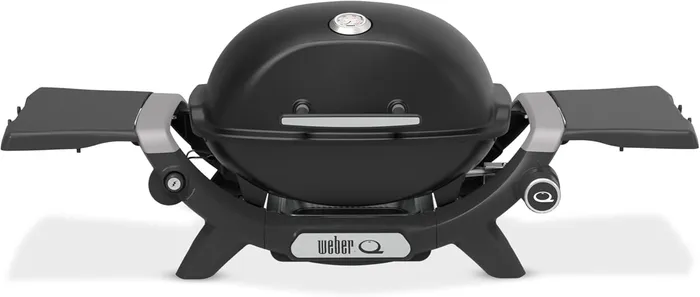 Barbecue à gaz Weber Q 1200N avec tablettes, idéal pour camping et balcons, brûleur haute performance, grilles en fonte, allumage électronique, noir