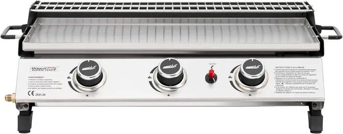 Plaque de Cuisson au Gaz Propane Royal Gourmet, Acier Inoxydable, 3 Brûleurs, 7.5 kW, Surface de 61,5x32 cm avec Grille Chauffante, Idéale pour Camping et Extérieur, Coloris Argent